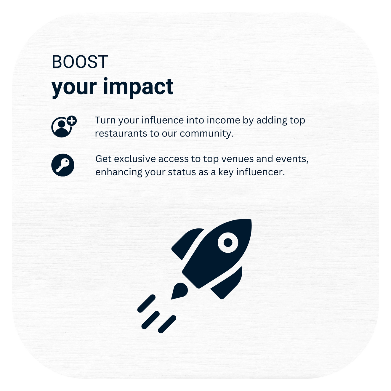 Influencers earn commissions for every restaurant they onboard. Additionally, influencers receive advertising on the app for each restaurant they bring onboard, enhancing their visibility and influence.